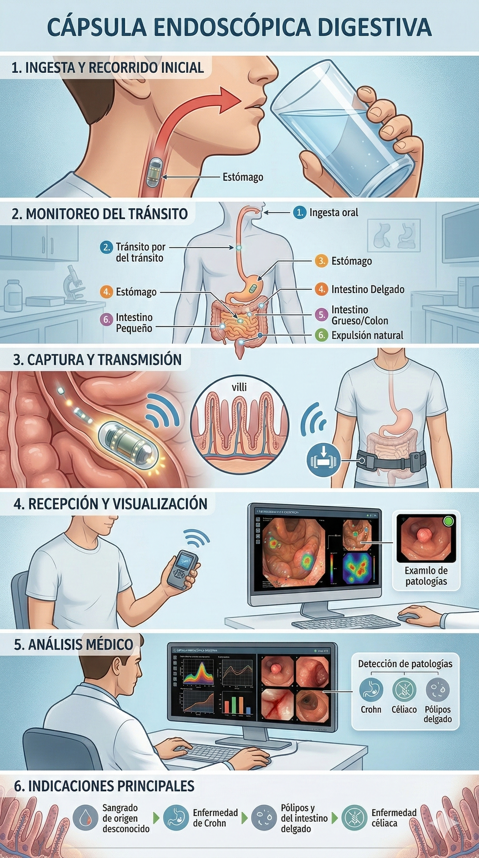 Estudio diágnostico del tuvo digestivo ingiriendo una videocápsula. Evaluamos intestino delgado y colón